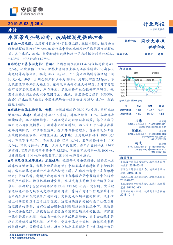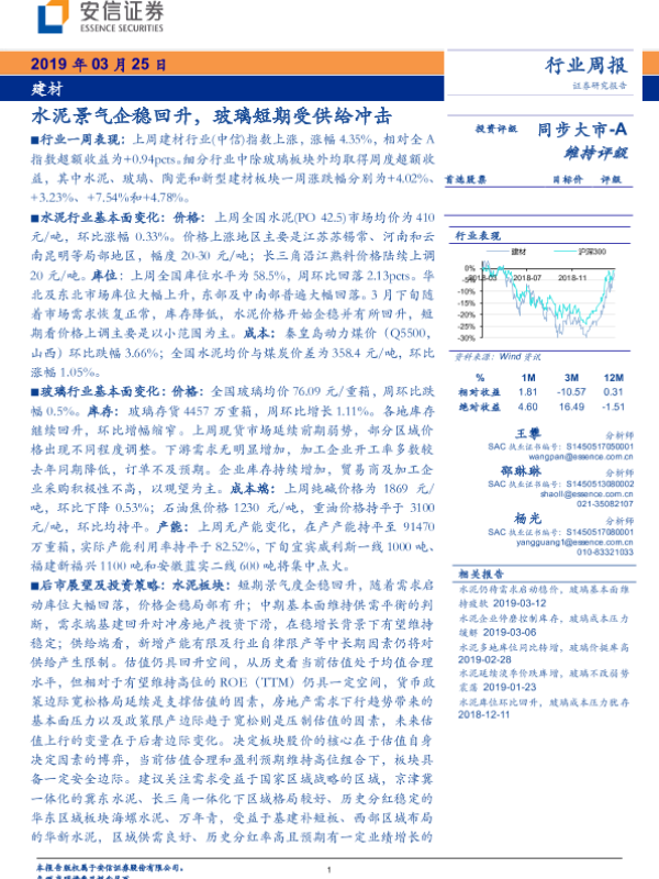 【安信证券】【20190325】建材行业周报:建材水泥景气企稳回升,玻璃短期受供给冲击-30页