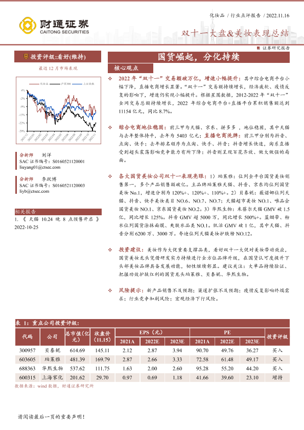 【财通证券】【20221116】化妆品:双十一大盘&美妆表现总结-国货崛起,分化持续-17页