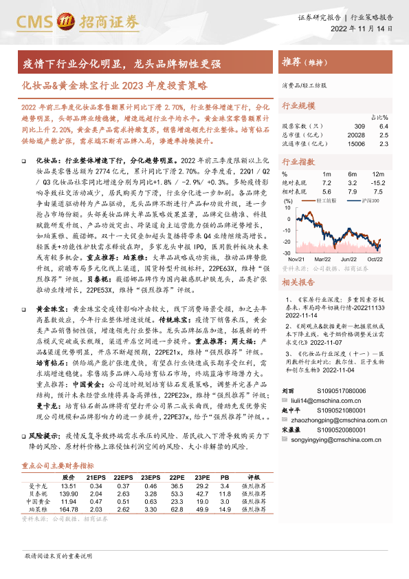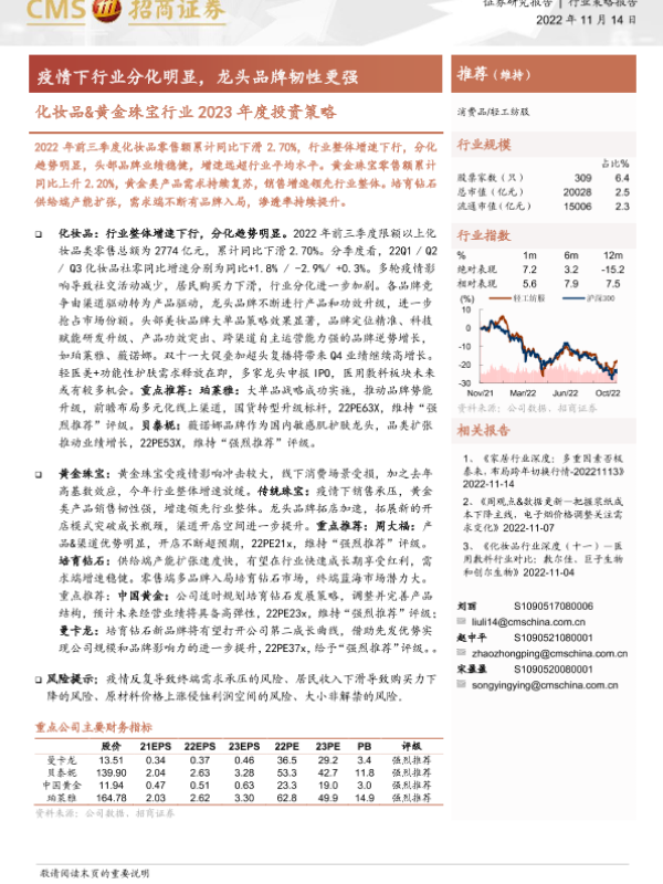 【海通证券】【20221114】化妆品&黄金珠宝行业2023年度投资策略:疫情下行业分化明显,龙头品牌韧性更强-26页