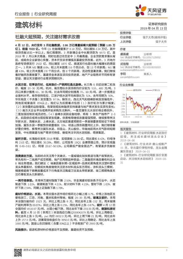 【天风证券】【20190413】建筑材料行业研究周报:社融大超预期,关注建材需求改善-9页
