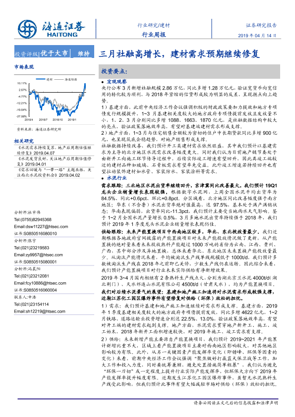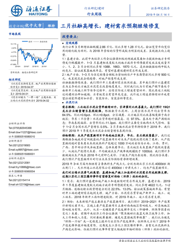 【海通证券】【20190414】三月社融高增长,建材需求预期继续修复-9页