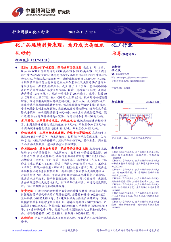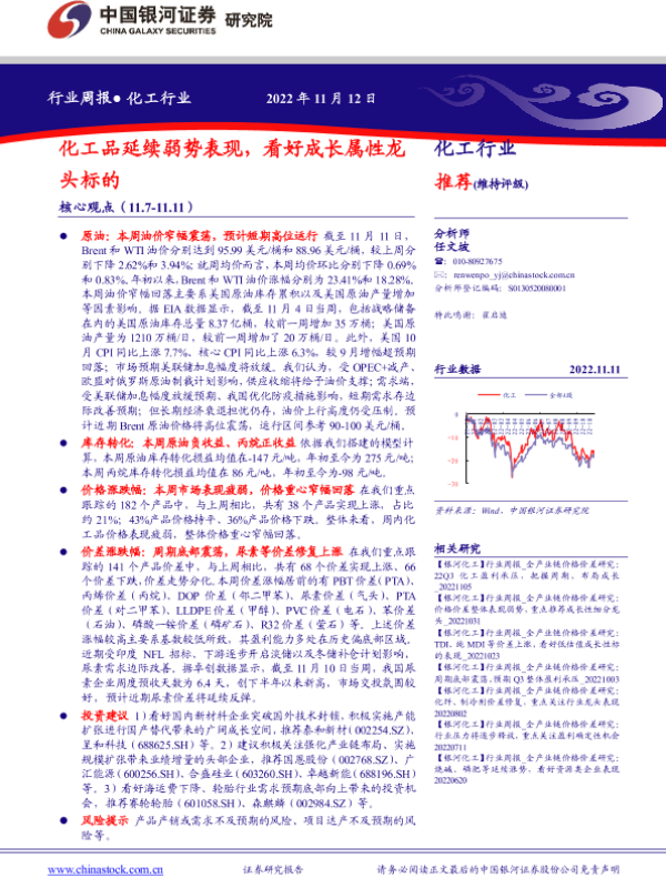 【银河证券】【20221112】化工行业周报:化工品延续弱势表现,看好成长属性龙头标的-18页