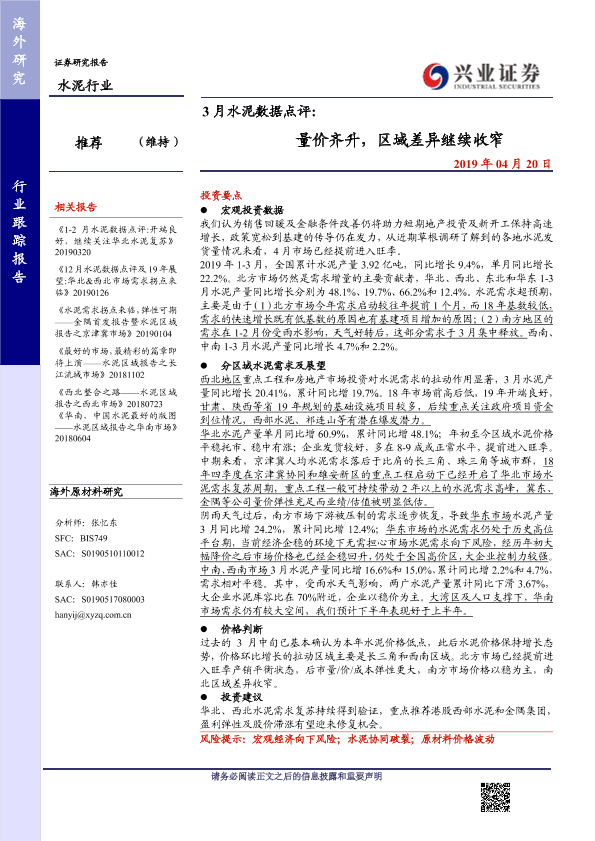【兴业证券】【20190420】3月水泥数据点评:量价齐升,区域差异继续收窄-9页