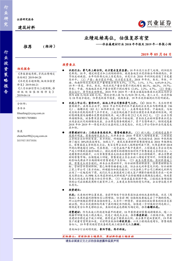 【兴业证券】【20190504】非金属建材行业2018年年报及2019年一季报小结:业绩延续高位,估值复苏有望-29页