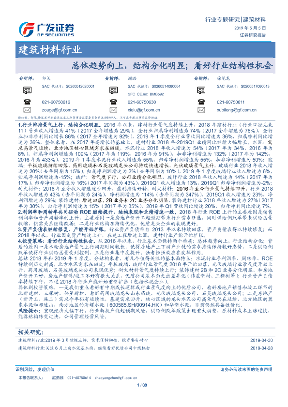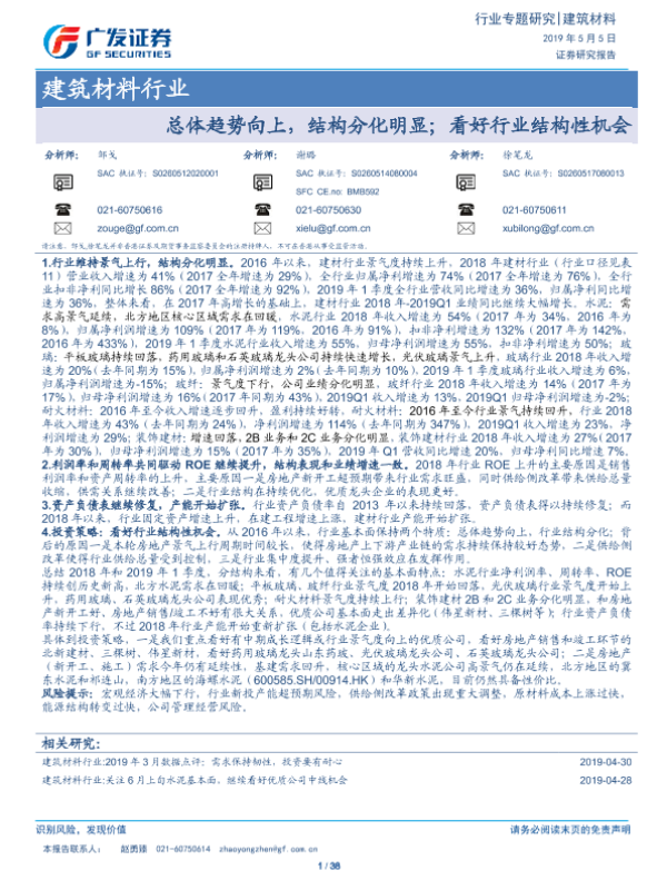 【广发证券】【20190505】建筑材料行业:总体趋势向上,结构分化明显;看好行业结构性机会-38页