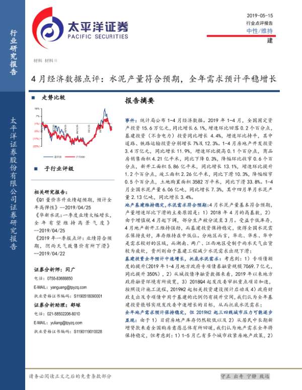 【太平洋证券】【20190515】4月经济数据点评:水泥产量符合预期,全年需求预计平稳增长-5页