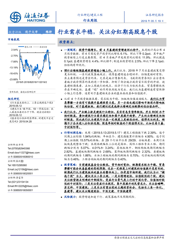 【海通证券】【20190519】建筑工程行业周报:行业需求平稳,关注分红期高股息个股-7页