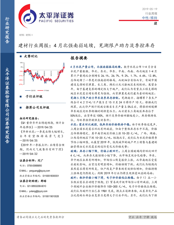 【太平洋证券】【20190519】建材行业周报:4月北强南弱延续,芜湖限产助力淡季控库存-20页