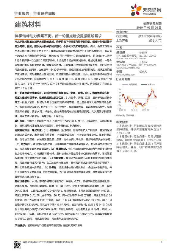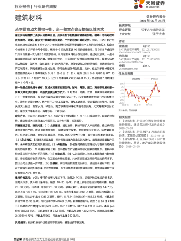 【天风证券】【20190526】建筑材料行业研究周报:淡季错峰助力供需平衡,新一轮重点建设提振区域需求-9页