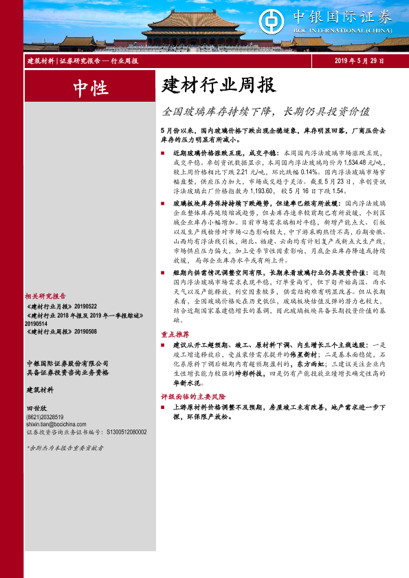 【中银证券】【20190529】建材行业周报:全国玻璃库存持续下降,长期仍具投资价值-14页