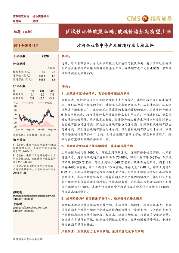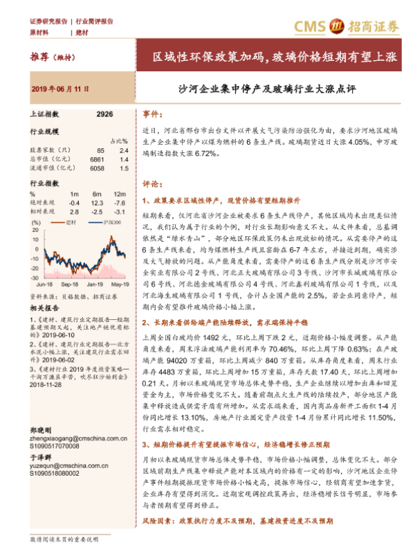 【海通证券】【20190611】沙河企业集中停产及玻璃行业大涨点评:区域性环保政策加码,玻璃价格短期有望上涨-3页