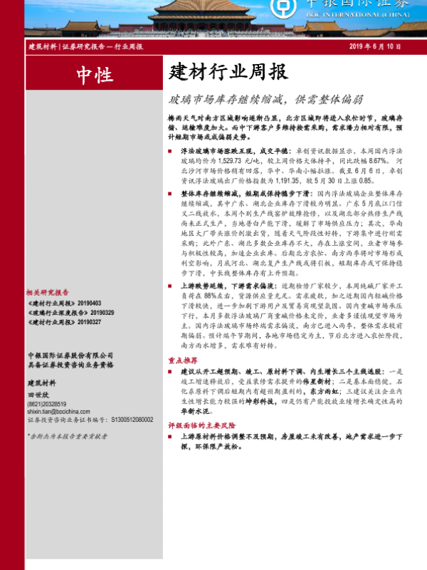 【中银证券】【20190610】建材行业周报:玻璃市场库存继续缩减,供需整体偏弱-14页