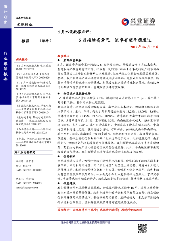 【兴业证券】【20190619】5月水泥数据点评:5月延续高景气,淡季有望平稳度过-9页