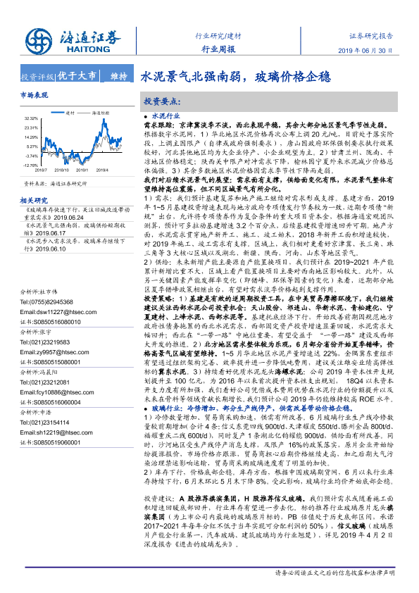 【海通证券】【20190630】建材行业周报:水泥景气北强南弱,玻璃价格企稳-8页