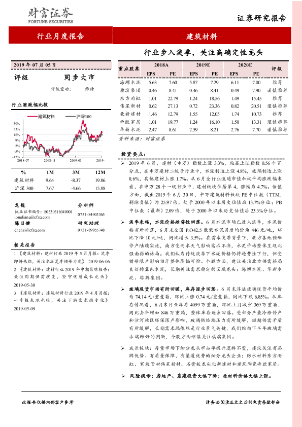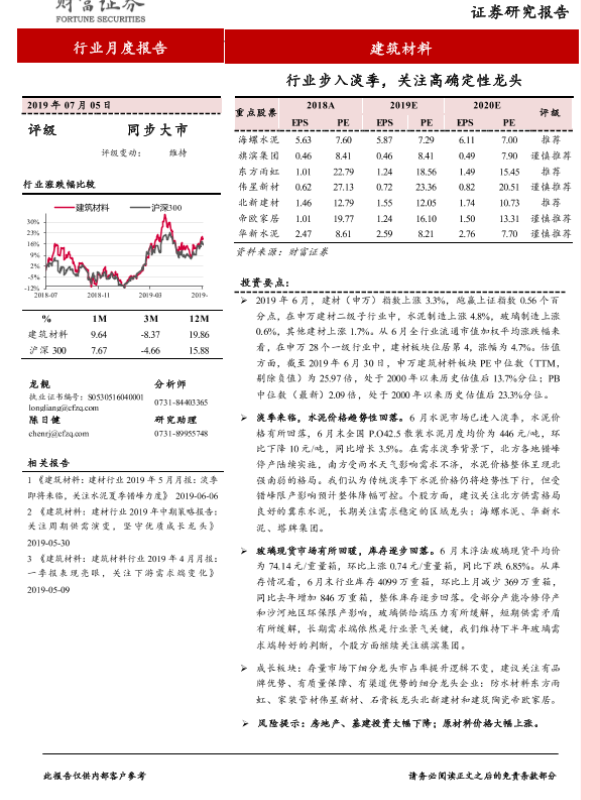 【财信证券】【20190705】建筑材料行业月度报告:行业步入淡季,关注高确定性龙头-9页