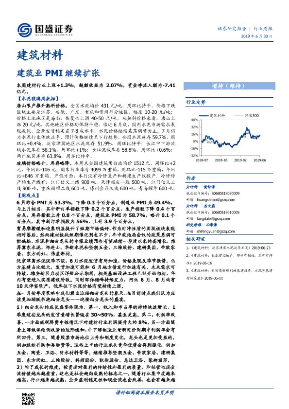 【国盛证券】【20190630】建筑材料行业周报:建筑业PMI继续扩张-26页