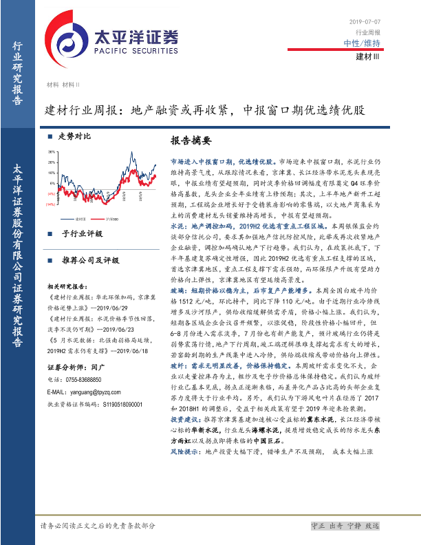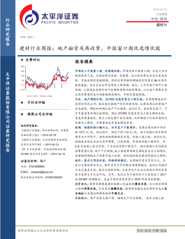【太平洋证券】【20190707】建材行业周报:地产融资或再收紧,中报窗口期优选绩优股-19页