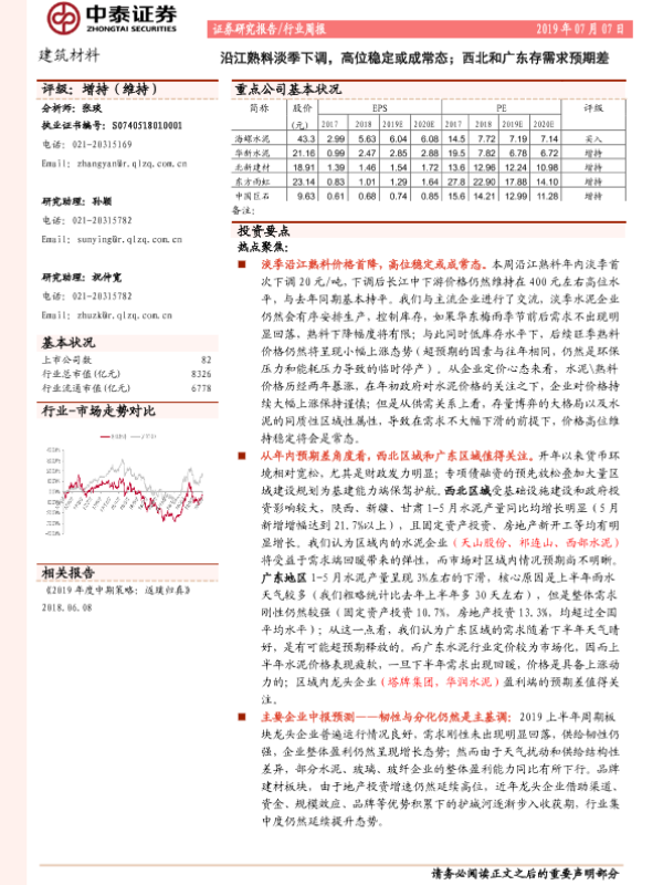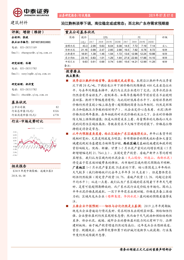 【中泰证券】【20190707】建筑材料行业周报:沿江熟料淡季下调,高位稳定或成常态;西北和广东存需求预期差-19页