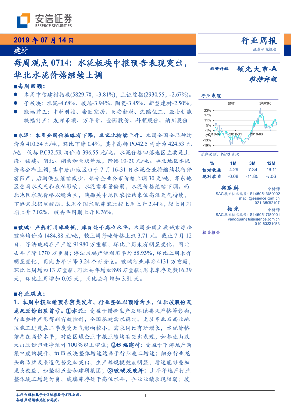 【安信证券】【20190714】建材行业每周观点:水泥板块中报预告表现突出,华北水泥价格继续上调-13页