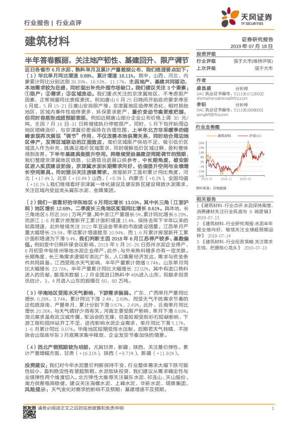 【天风证券】【20190718】建筑材料:半年答卷靓丽,关注地产韧性、基建回升、限产调节-8页