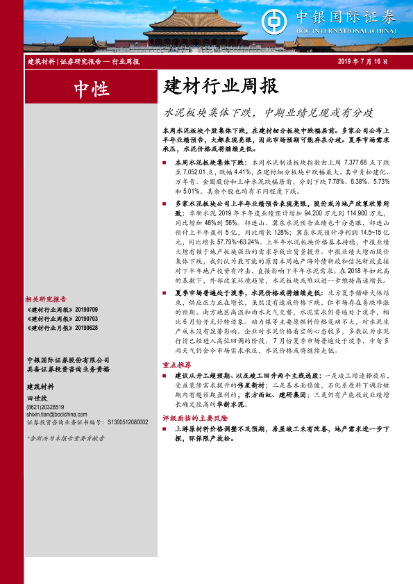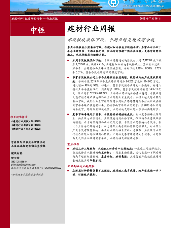 【中银证券】【20190716】建材行业周报:水泥板块集体下跌,中期业绩兑现或有分歧-14页