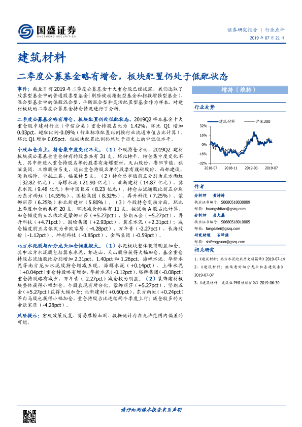 【国盛证券】【20190721】建筑材料行业点评:二季度公募基金略有增仓,板块配置仍处于低配状态-7页