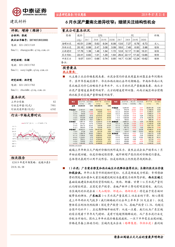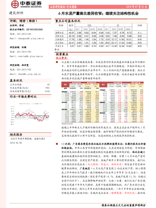 【中泰证券】【20190721】6月水泥产量南北差异收窄;继续关注结构性机会-20页