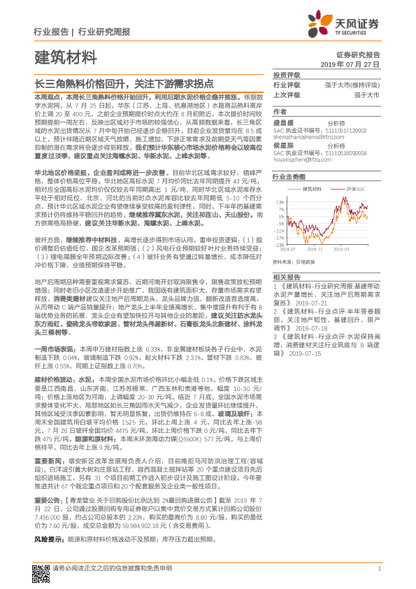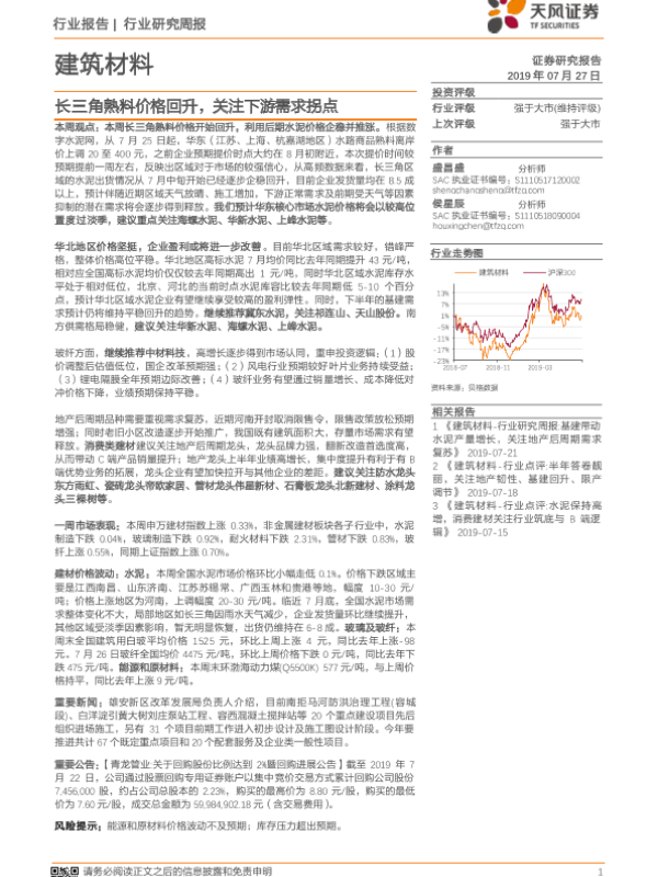 【天风证券】【20190727】建筑材料行业研究周报:长三角熟料价格回升,关注下游需求拐点-11页