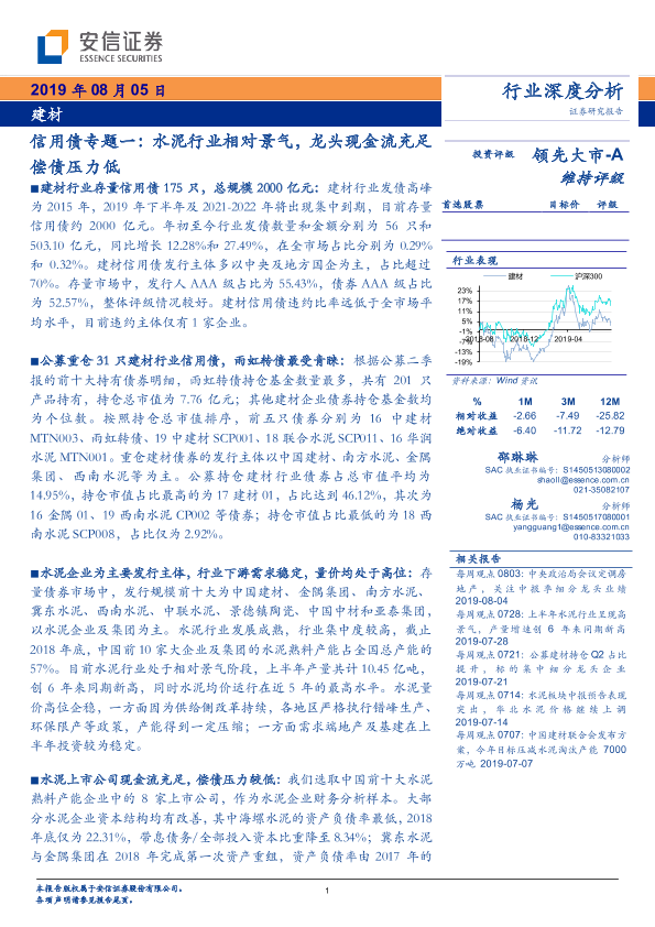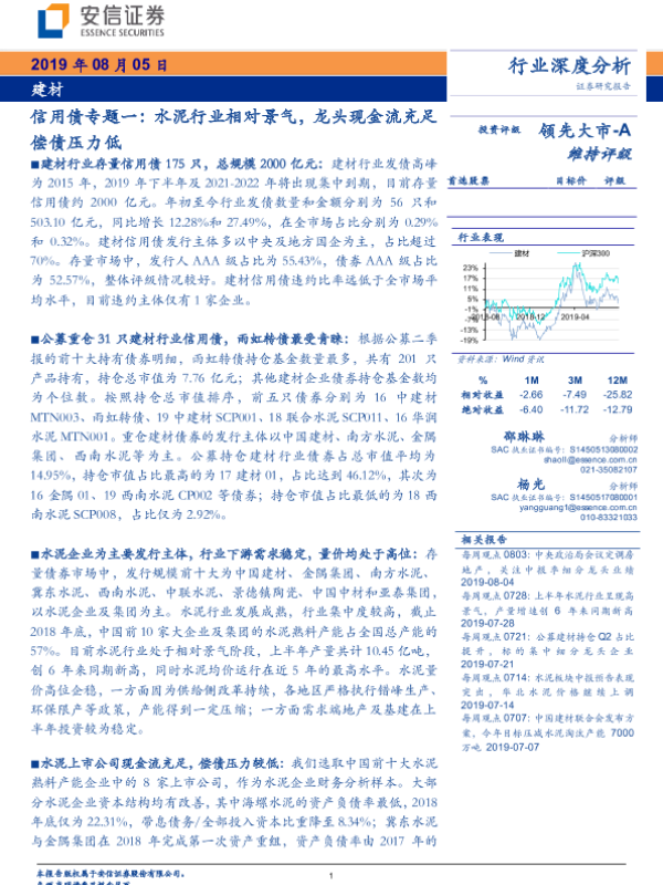 【安信证券】【20190805】建材行业深度分析:信用债专题一:水泥行业相对景气,龙头现金流充足偿债压力低-23页