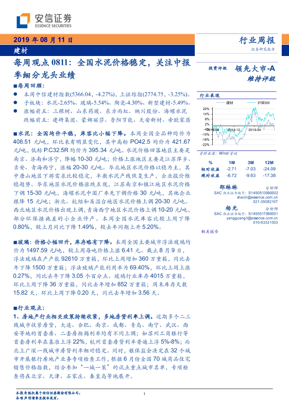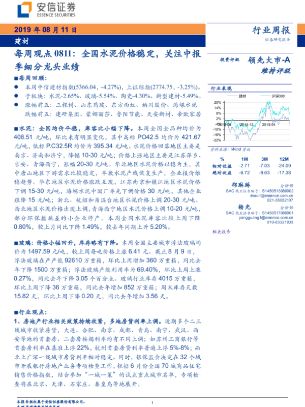 【安信证券】【20190811】建材每周观点:全国水泥价格稳定,关注中报季细分龙头业绩-12页