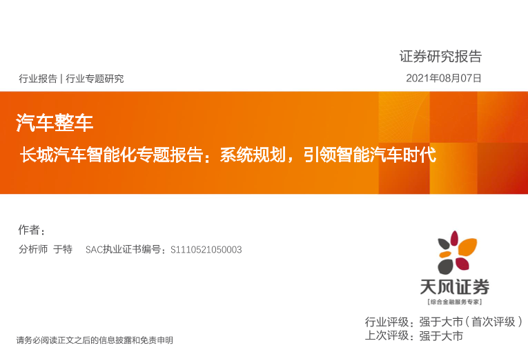 【天风证券】【20210807】汽车整车行业长城汽车智能化专题报告:系统规划,引领智能汽车时代-40页