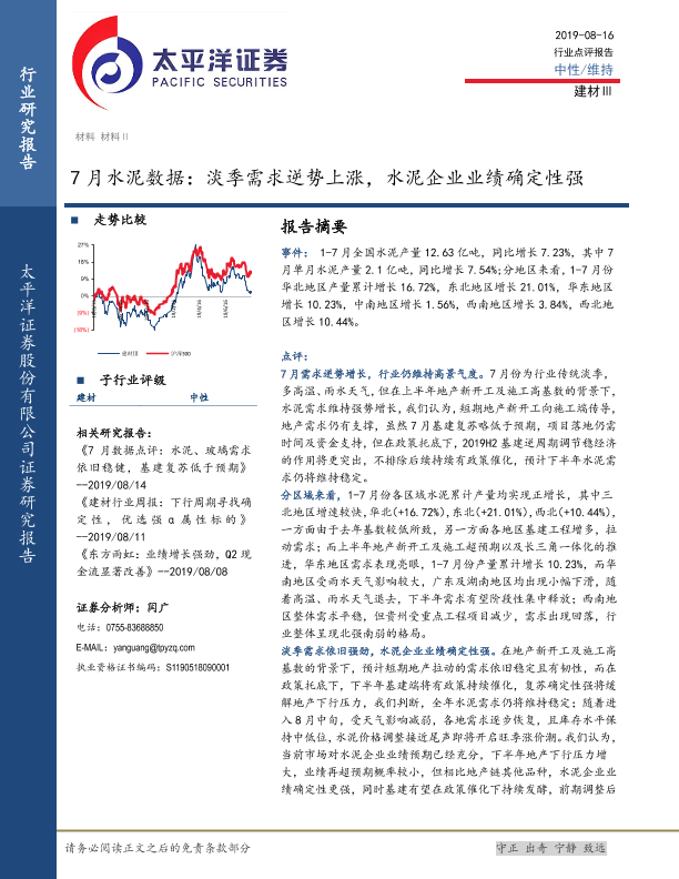 【太平洋证券】【20190816】7月水泥数据:淡季需求逆势上涨,水泥企业业绩确定性强-5页