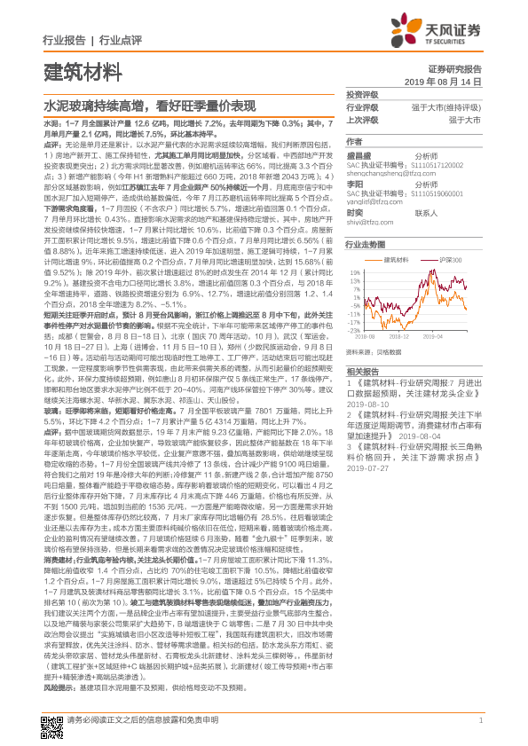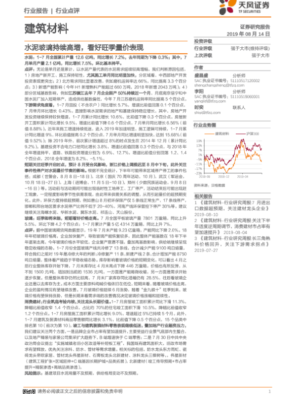 【天风证券】【20190814】建筑材料:水泥玻璃持续高增,看好旺季量价表现-6页