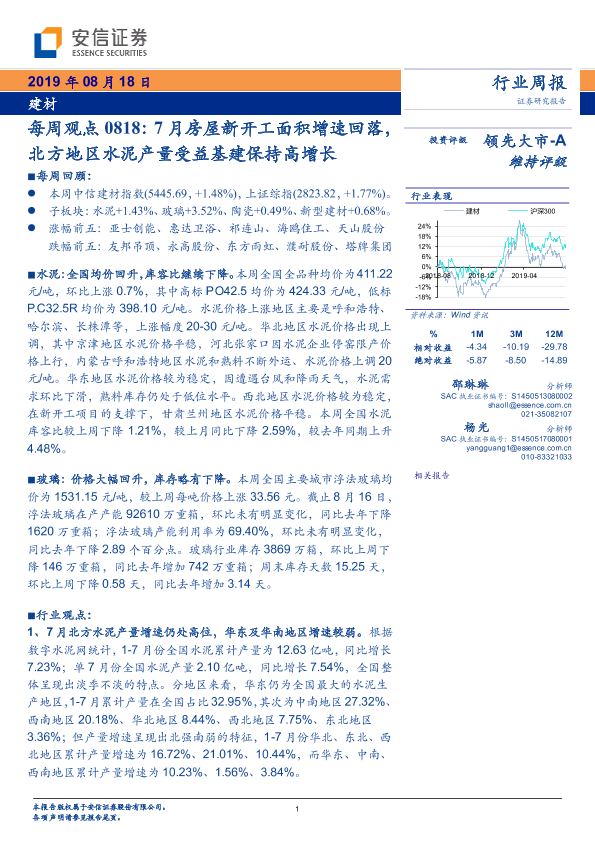【安信证券】【20190818】建材每周观点:7月房屋新开工面积增速回落,北方地区水泥产量受益基建保持高增长-12页
