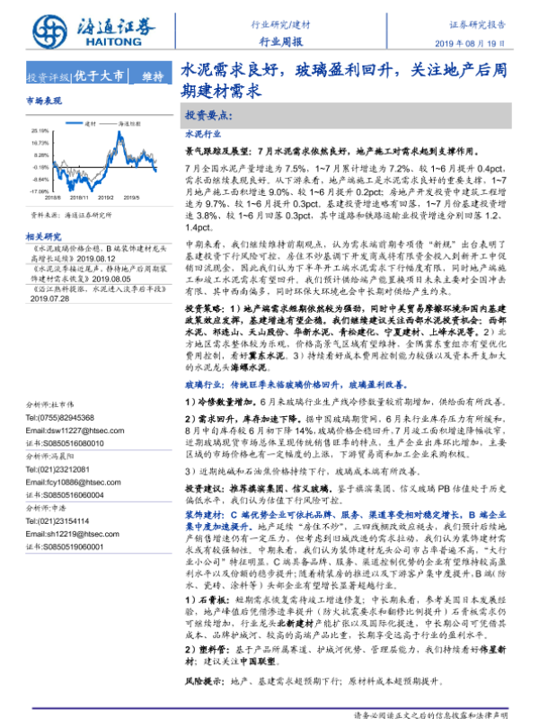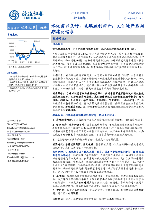 【海通证券】【20190819】建材行业周报:水泥需求良好,玻璃盈利回升,关注地产后周期建材需求-8页