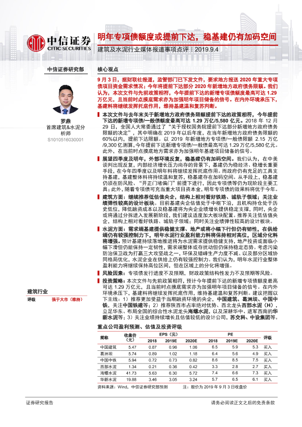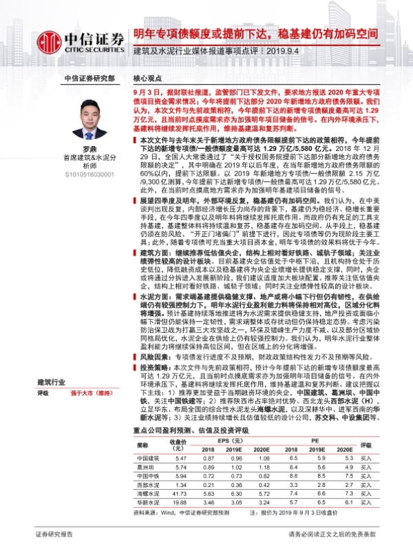 【中信证券】【20190904】建筑及水泥行业媒体报道事项点评:明年专项债额度或提前下达,稳基建仍有加码空间-2页