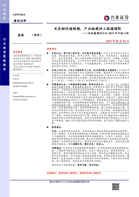【兴业证券】【20190904】非金属建材行业2019年中报小结:水泥韧性超预期,产业链建材工程端领衔-24页