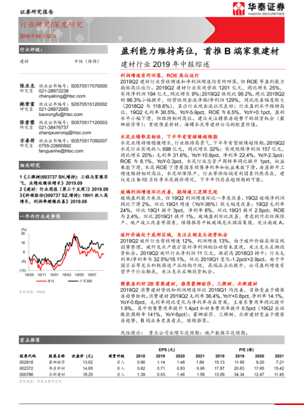 【华泰证券】【20190902】建材行业2019年中报综述:盈利能力维持高位,首推B端家装建材-22页