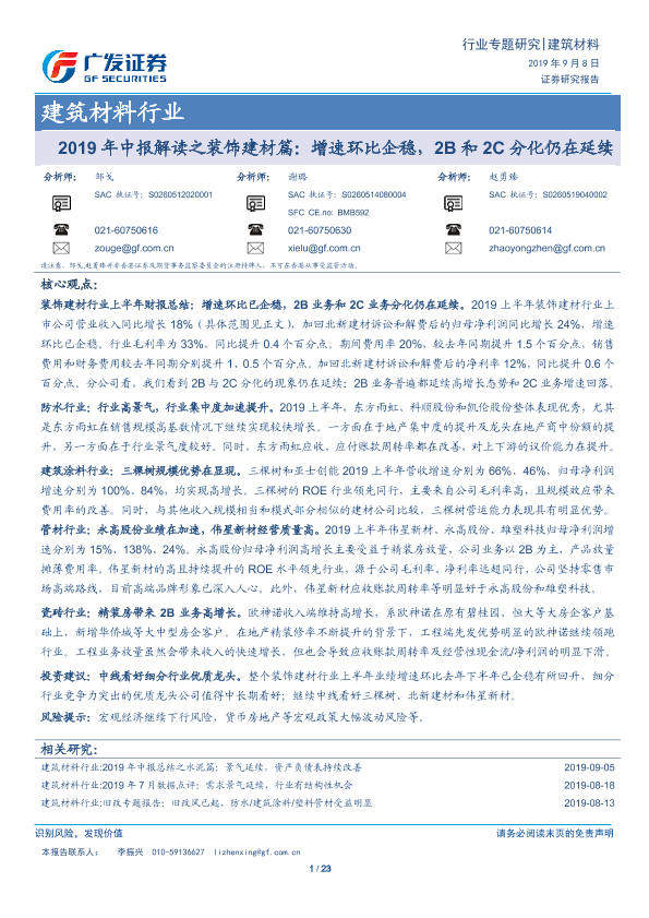 【广发证券】【20190908】2019年中报解读之装饰建材篇:增速环比企稳,2B和2C分化仍在延续-23页