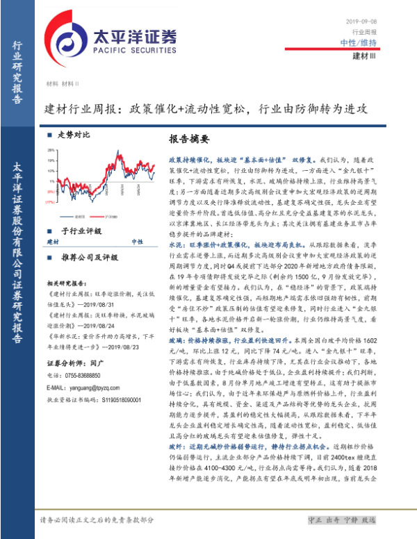 【太平洋证券】【20190908】建材行业周报:政策催化+流动性宽松,行业由防御转为进攻-19页