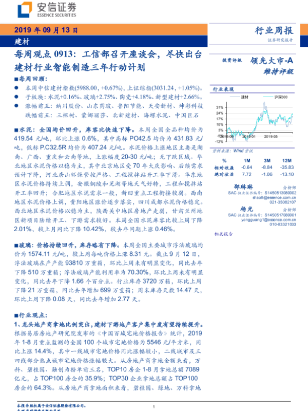 【安信证券】【20190913】建材行业每周观点:工信部召开座谈会,尽快出台建材行业智能制造三年行动计划-12页