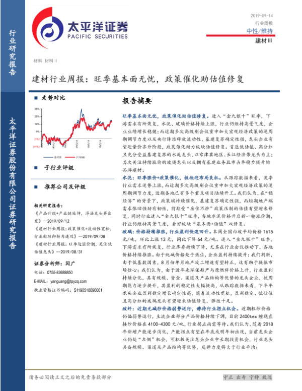 【太平洋证券】【20190914】建材行业周报:旺季基本面无忧,政策催化助估值修复-19页