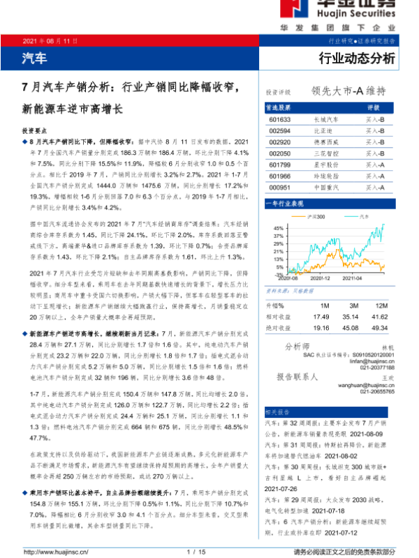 【华金证券】【20210811】汽车行业7月汽车产销分析:行业产销同比降幅收窄,新能源车逆市高增长-15页