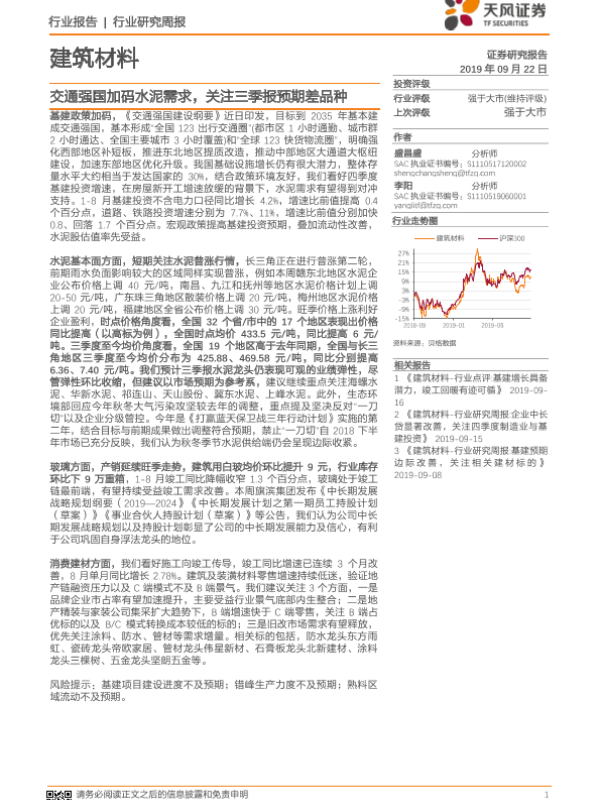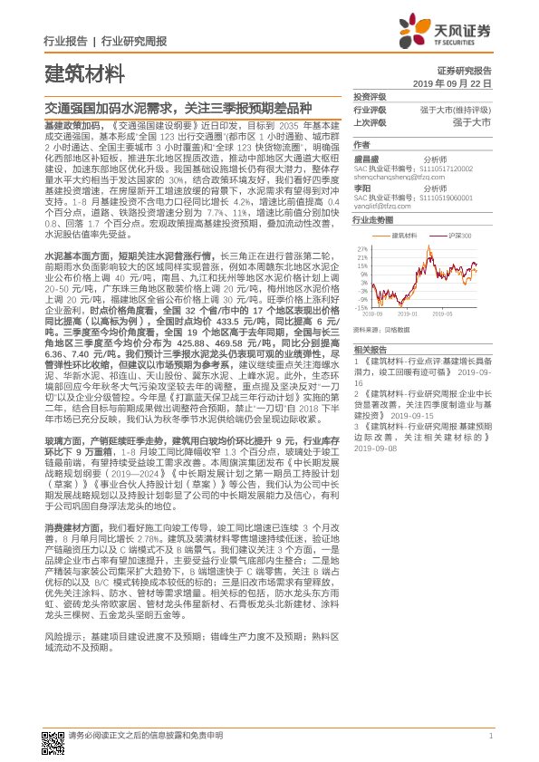 【天风证券】【20190922】建筑材料行业研究周报:交通强国加码水泥需求,关注三季报预期差品种-10页