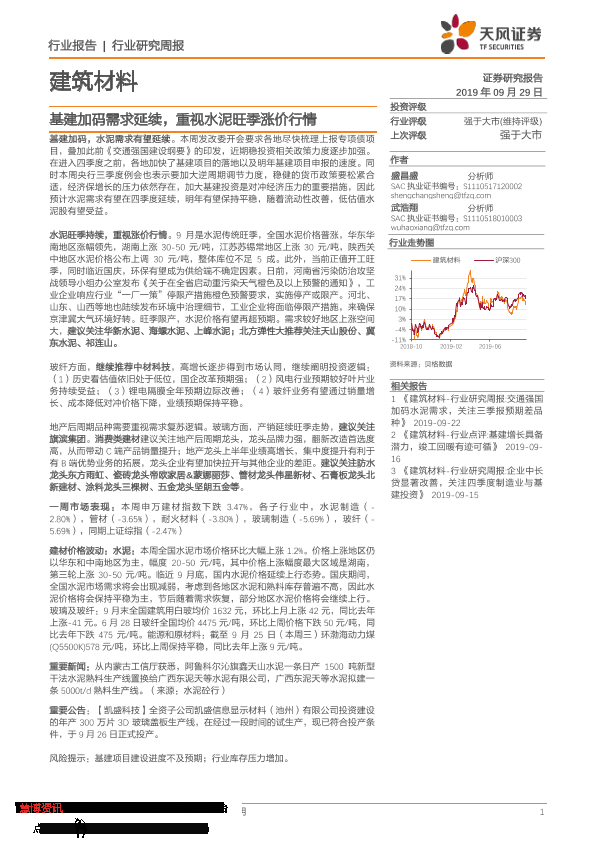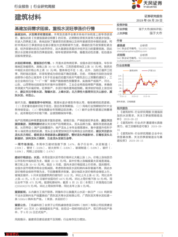 【天风证券】【20190929】建筑材料行业研究周报:基建加码需求延续,重视水泥旺季涨价行情-9页