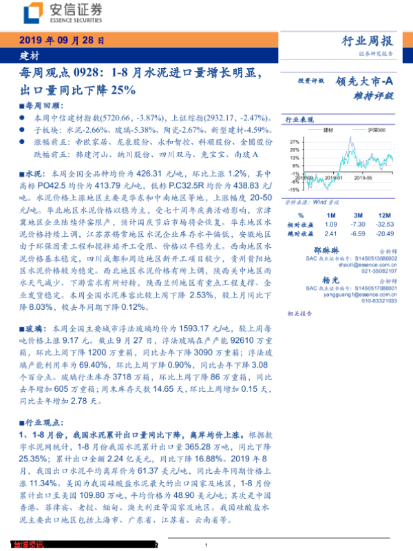【安信证券】【20190928】建材行业每周观点:1-8月水泥进口量增长明显,出口量同比下降25%-12页