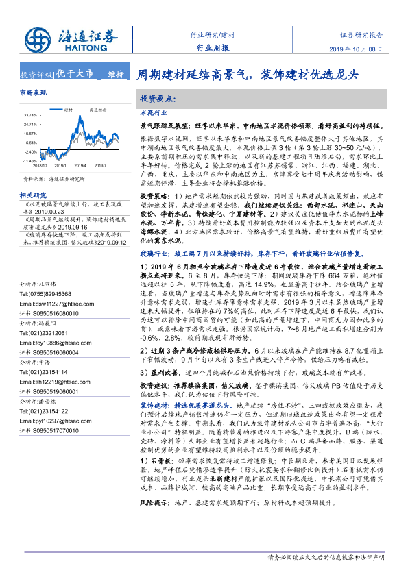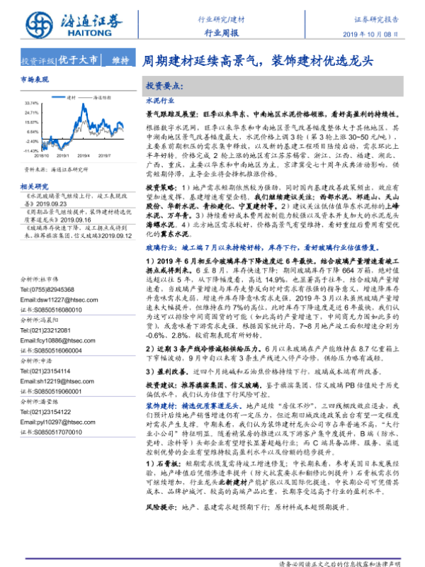 【海通证券】【20191008】建材行业周报:周期建材延续高景气,装饰建材优选龙头-8页