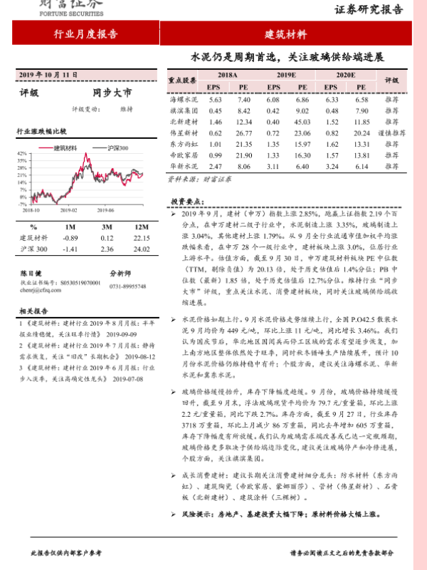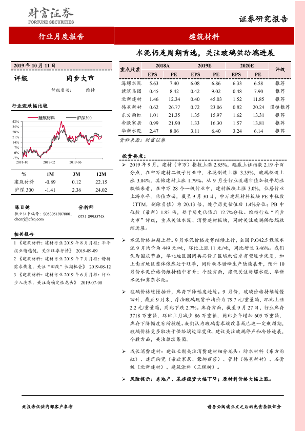 【财信证券】【20191011】建筑材料行业月度报告:水泥仍是周期首选,关注玻璃供给端进展-10页