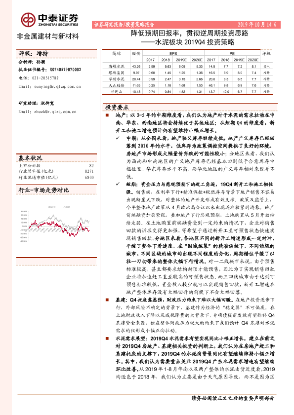【中泰证券】【20191014】水泥板块2019Q4投资策略:降低预期回报率,贯彻逆周期投资思路-28页