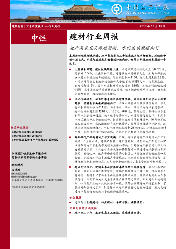 【中银证券】【20191015】建材行业周报:地产集采龙头再超预期,水泥玻璃数据向好-13页